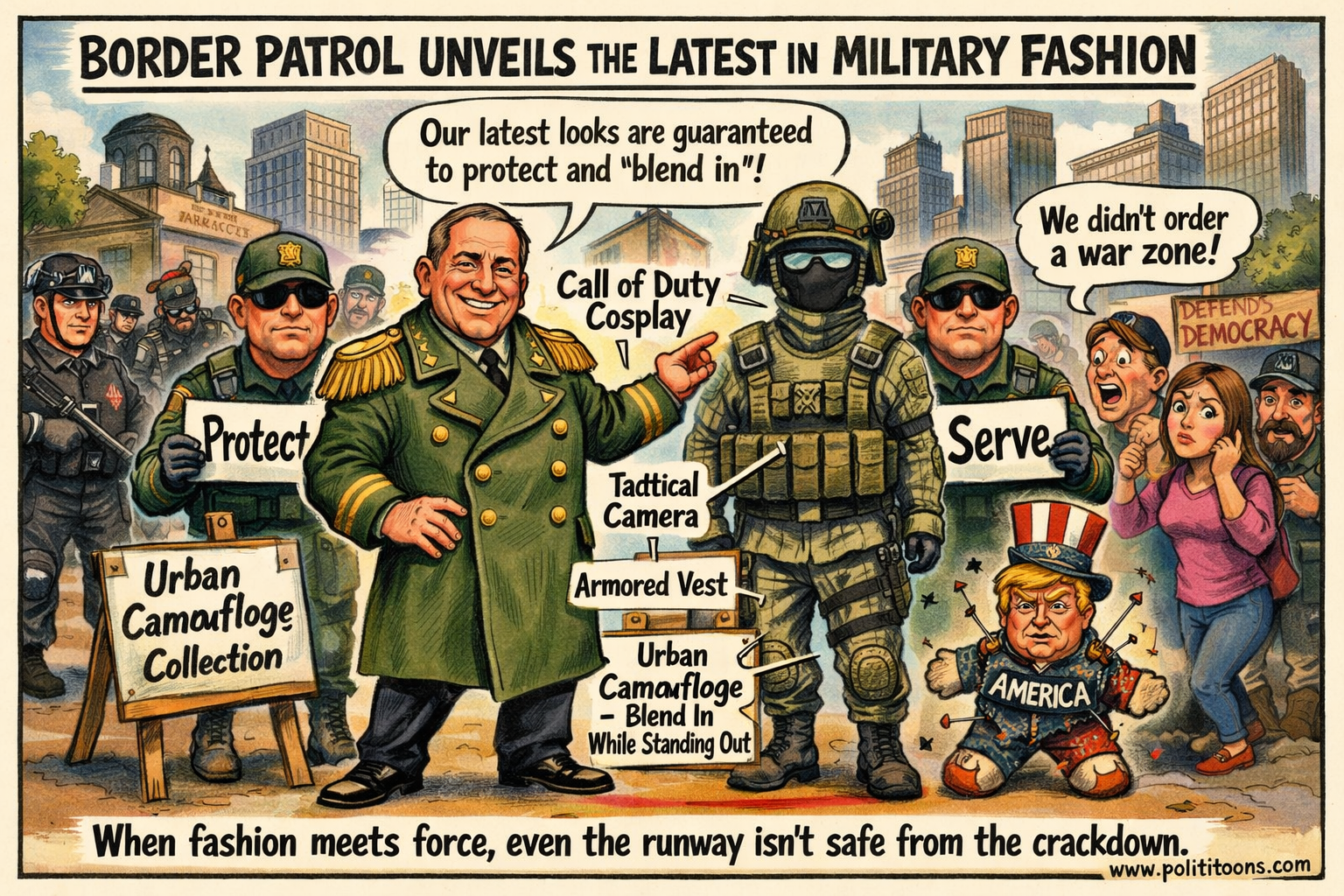 “Border Patrol's new fashion line: because nothing says 'protect and serve' quite like a wardrobe…”Sign up free to read this jokeGet unlimited access to our full archive of political cartoons and jokes.Sign up freeHeadline SourcesHere's a summary: **The Coat Controversy and What It Actually Signals** When Border Patrol Commander Greg Bovino appeared in Minneapolis wearing an olive double-breasted overcoat with brass buttons and epaulettes, critics on social media called it "Nazi cosplay." However, this criticism misidentifies the historical reference. The greatcoat style dates to the 19th century and has been worn by military forces worldwide, including Allied troops in WWII and even fictional characters like Doctor Who. **The Real Issue: Militarization** While the Nazi comparison misses the mark, the underlying discomfort points to something real—the increasing militarization of immigration enforcement. Uniforms matter for three reasons: they signal what an institution believes about itself, they shape public perception, and they influence how personnel see themselves. Research on "enclothed cognition" shows that clothing affects behavior—police uniforms, for instance, can heighten threat sensitivity and readiness to use force. **A Visual History of Change** In the 1950s, Border Patrol agents wore tailored uniforms projecting civil authority: cropped jackets, neckties, pressed trousers, and campaign hats drawn from police and cavalry traditions. Today's immigration enforcement looks dramatically different: ballistic helmets with cameras, armored vests, cargo pants, balaclavas, and camouflage patterns that serve no practical purpose on city streets but import the visual language of warfare. **The Consequences** This transformation encourages agents to see themselves not as civil servants administering law, but as combatants in hostile territory. The author suggests this shift may partially explain aggressive tactics in Minneapolis, including use of chemical irritants against demonstrators and the fatal shooting of 37-year-old Renée Good. The result is a self-reinforcing cycle: militarized dress fosters aggressive posture, which fuels public fear, which then justifies further militarization. When domestic agencies dress for war, they risk acting as if they're at war—even against the public they serve.via politico.com