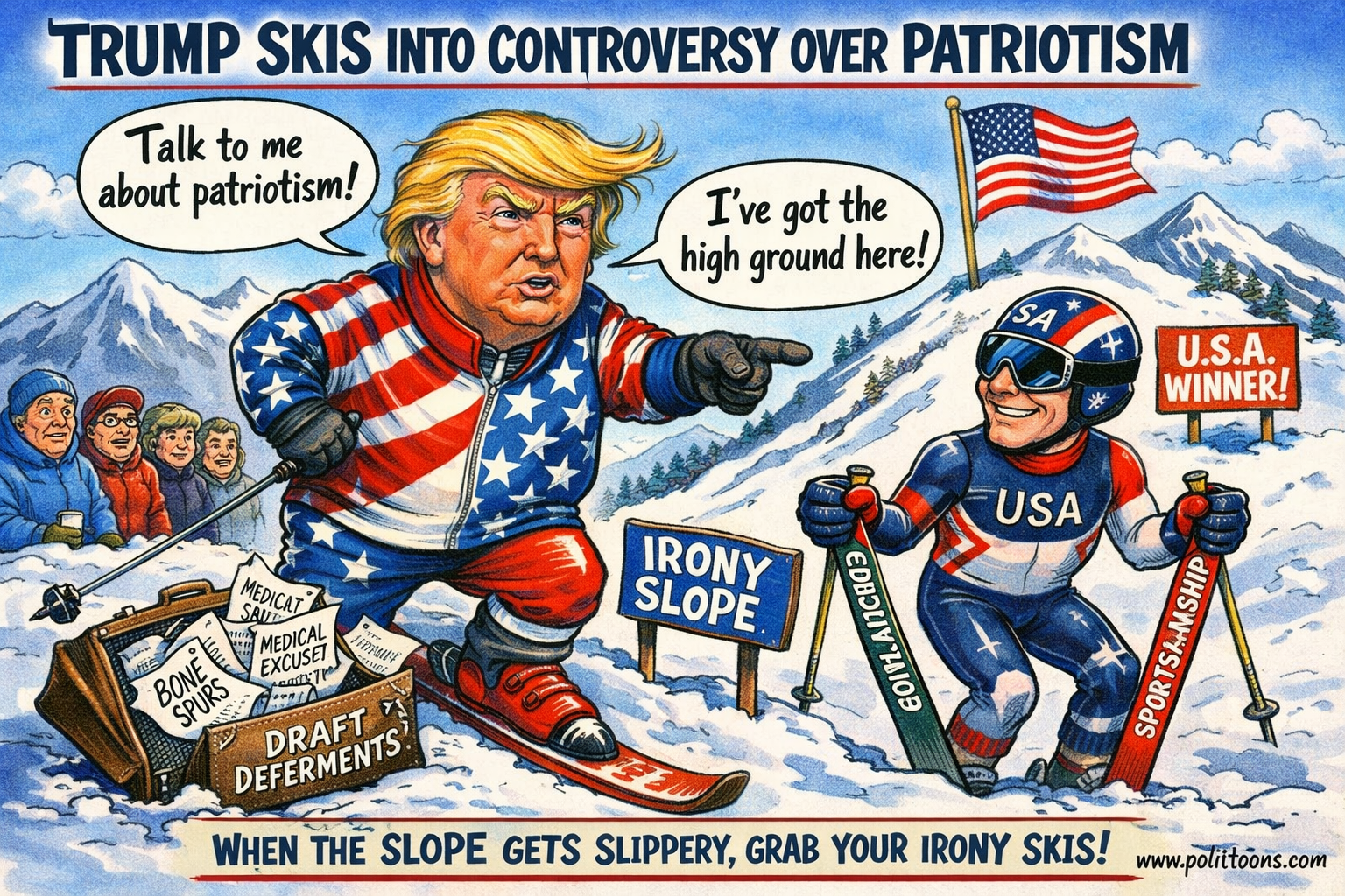 “Trump attacking an Olympic skier for not representing America is like a guy who dodged the draft…”Sign up free to read this jokeGet unlimited access to our full archive of political cartoons and jokes.Sign up freeHeadline SourcesTrump rips Olympic skier over remarks about representing USvia The Hill